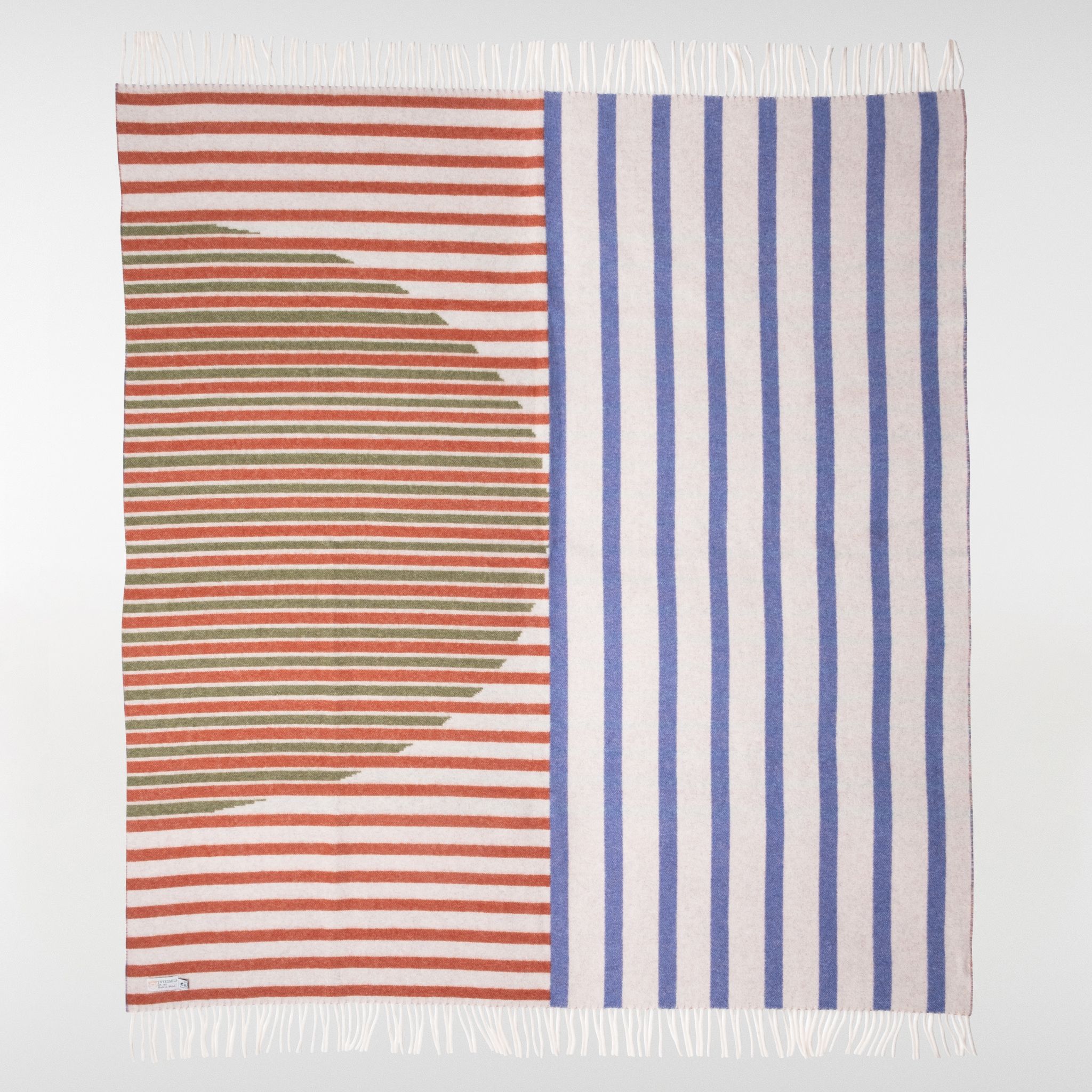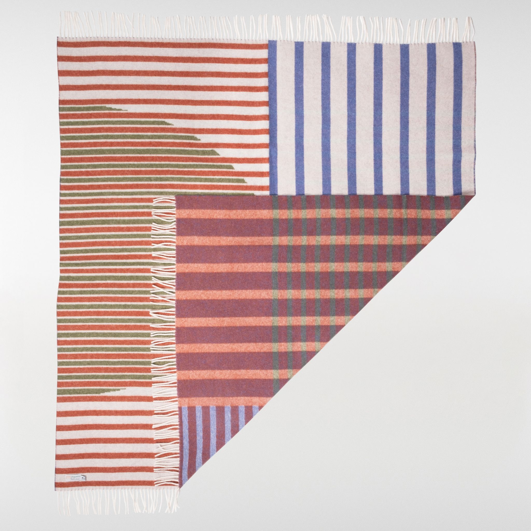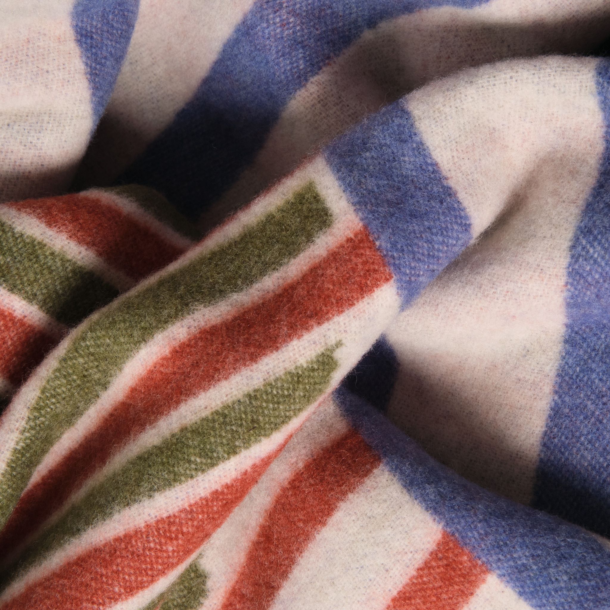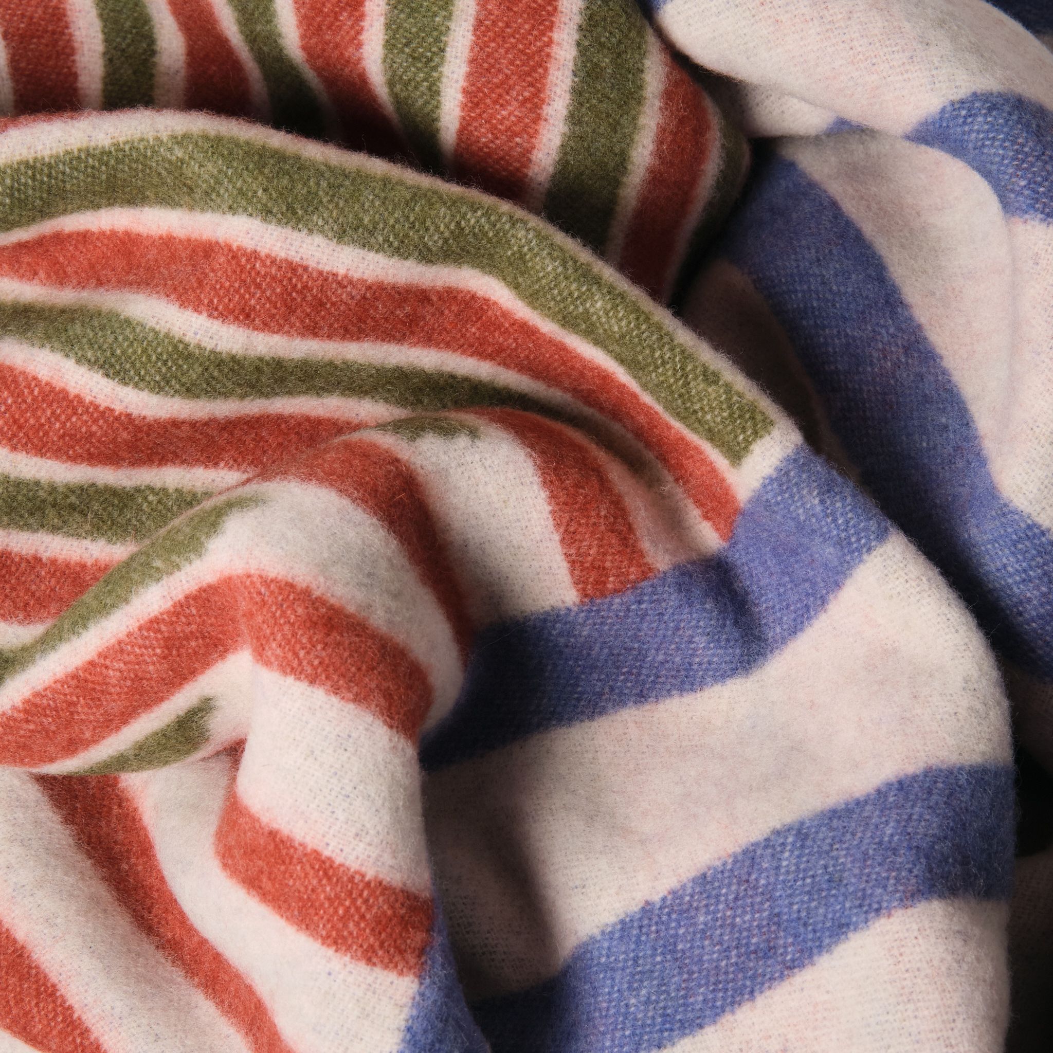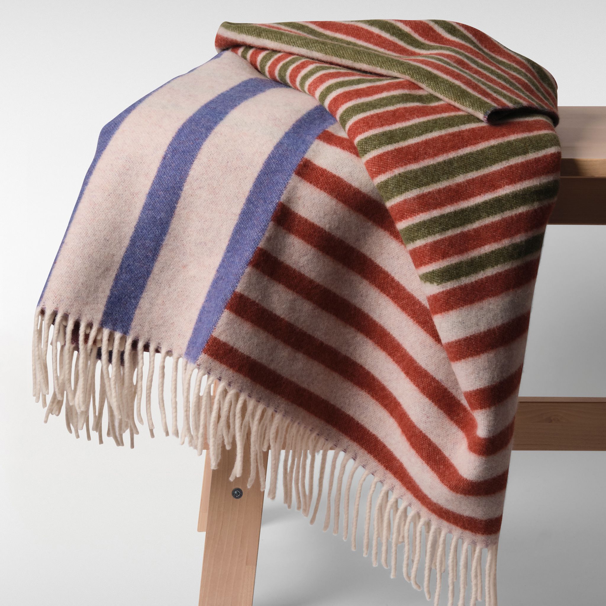 Fresh, playful, and rooted in tradition. The Cladd Wool Throw brings together bold stripes of deep blue, warm rust, and earthy green against a soft neutral base.