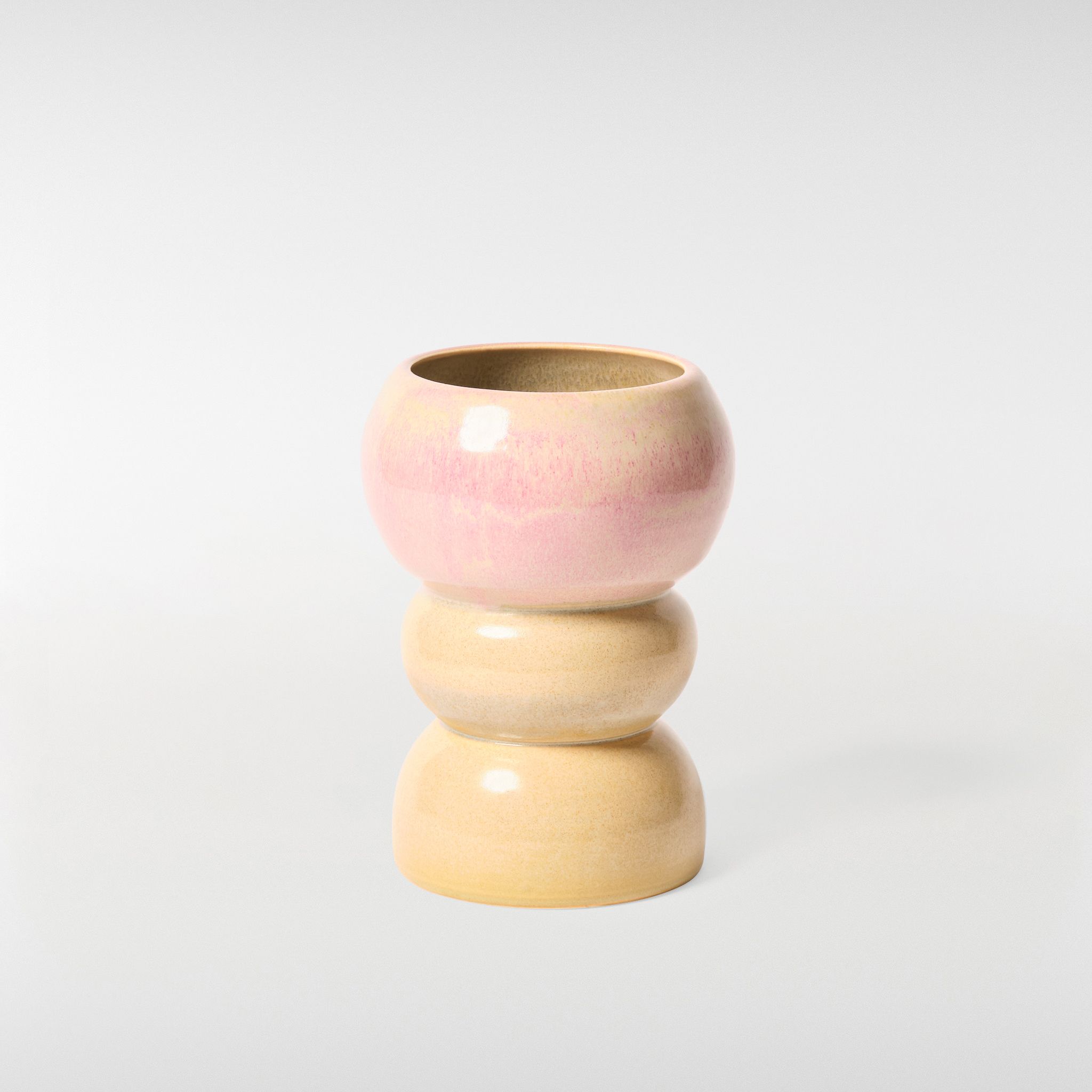 A warm sandy base builds upward into a blush-toned top, where the glaze shifts gently from earthy beige to a delicate pink wash.